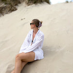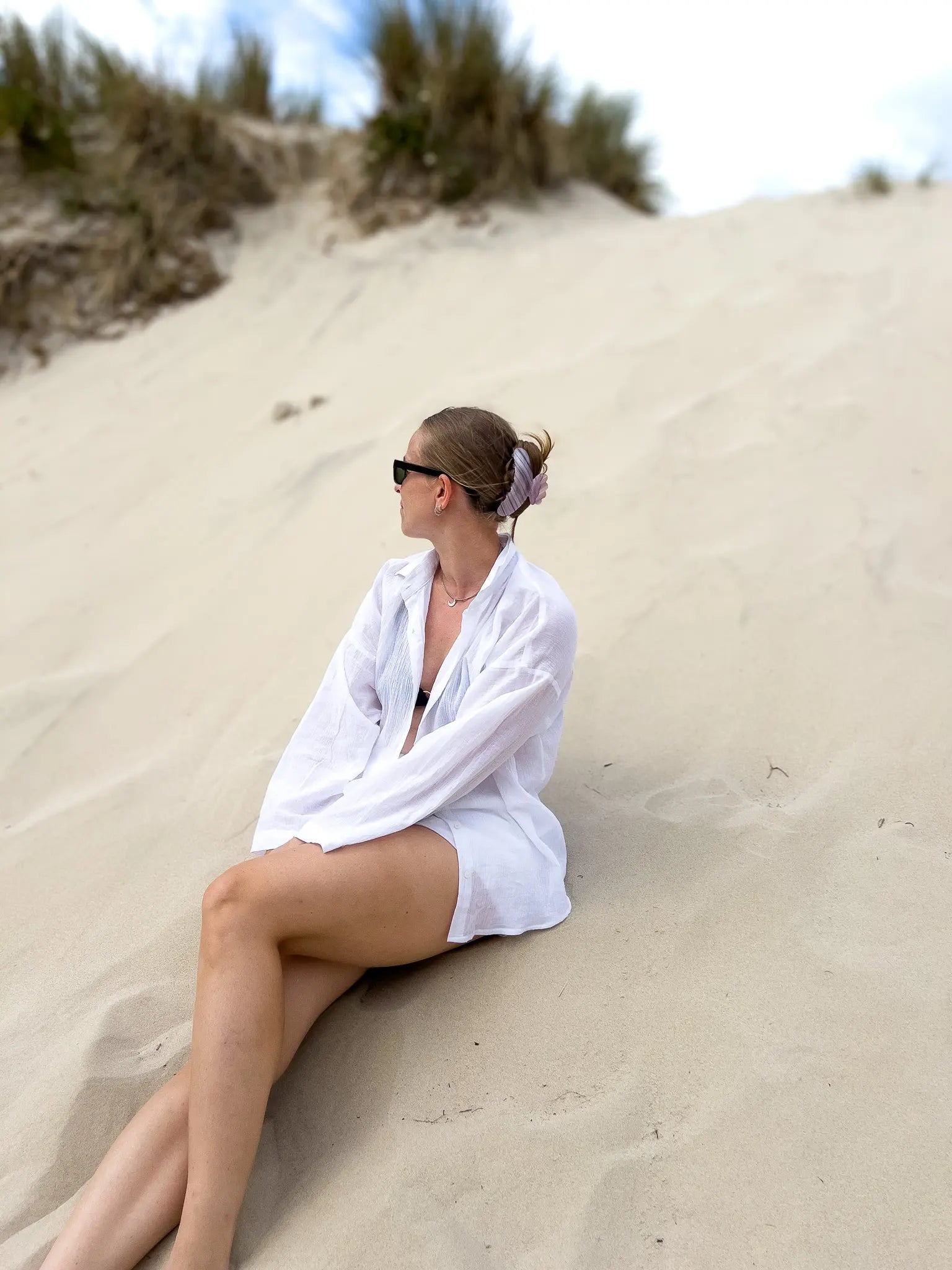Introducing the Wiild Keila Shirt. This oversized, crinkled linen shirt is perfect for layering over your swimwear at the beach.