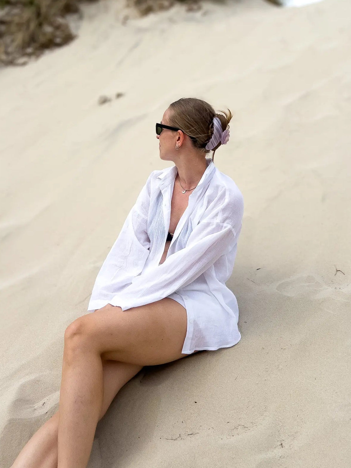 Introducing the Wiild Keila Shirt. This oversized, crinkled linen shirt is perfect for layering over your swimwear at the beach.